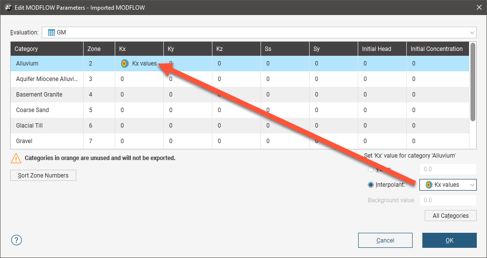 In the Edit MODFLOW Parameters window, you can enter the values for hydrological properties manually or you can use the values from an interpolant.