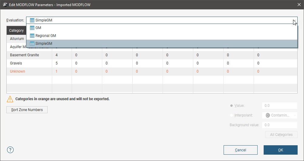 For MODFLOW models created in Leapfrog Geo, the evaluation used when creating the model will automatically be assigned as the evaluation for export. A hydrological properties table (