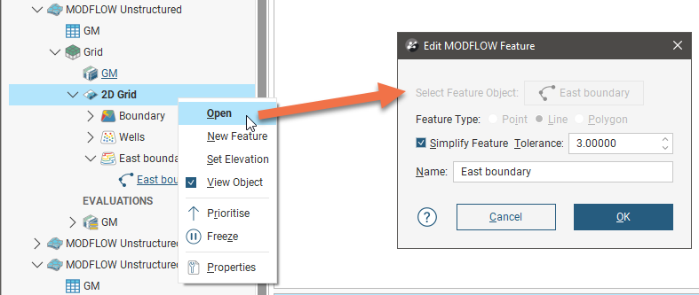 To add features to the model, expand it in the project tree, then right-click on the 2D grid object (