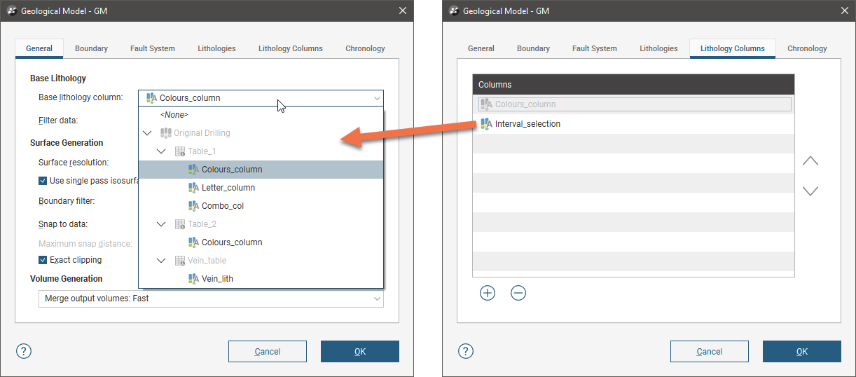 - Derived from linked lithology data. Other lithology data in the project can be linked to the geological model. This can be done in the Lithology Columns tab, and is discussed below. As with the codes derived from the base lithology column, changes to that data will be updated in the geological model, and vice versa.