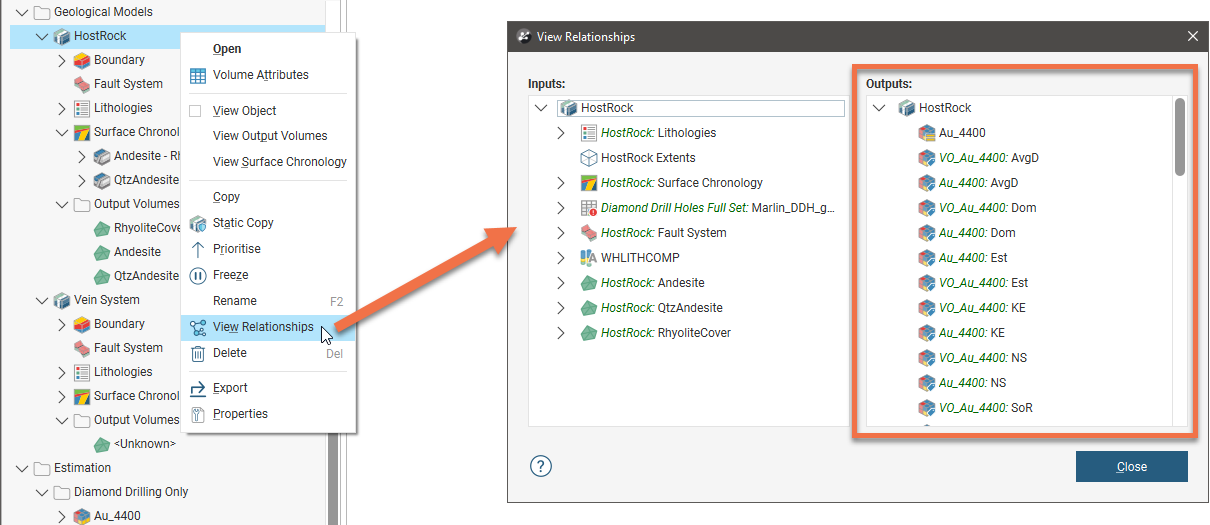 Use the View Relationships tool to check relationships between the geological model and other objects in the project. For example, here we can see that changing the base lithology column for the HostRock model has the potential to impact all the objects in the Outputs list: