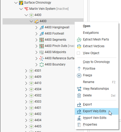 For veins, export any edits you have made to vein surfaces as described in Exporting and Importing Pinch Out, Segment and Midpoint Edits in the Veins topic.
