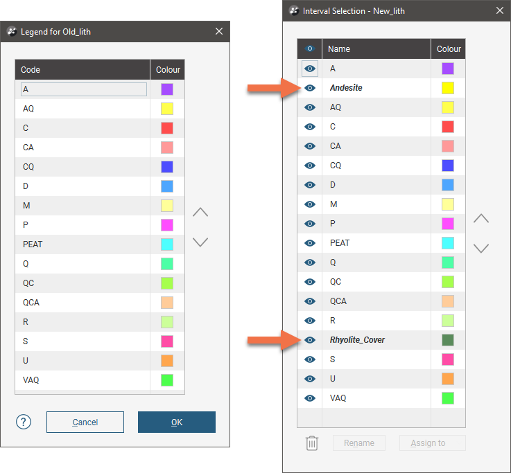 Note that the Andesite code in the New_lith column uses the colour yellow, whereas the manually defined code uses purple.