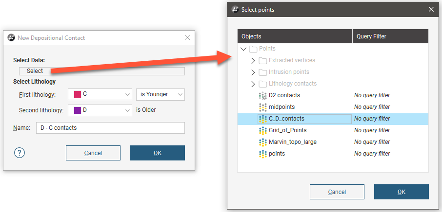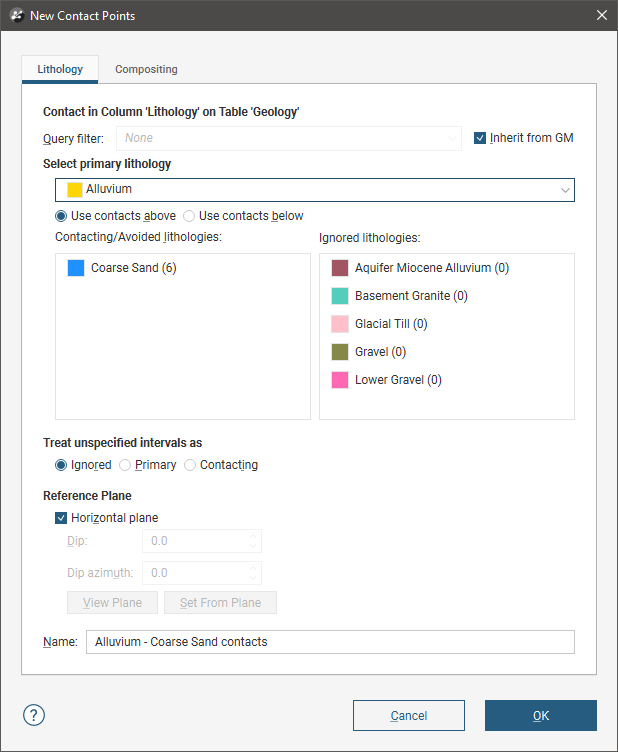 Select the First Lithology and Second Lithology, if known. Click OK. The New Contact Points window will appear. Assign the Primary lithology, Contacting/Avoided lithologies and the Ignored lithologies. These can only be selected from the model’s base lithology.