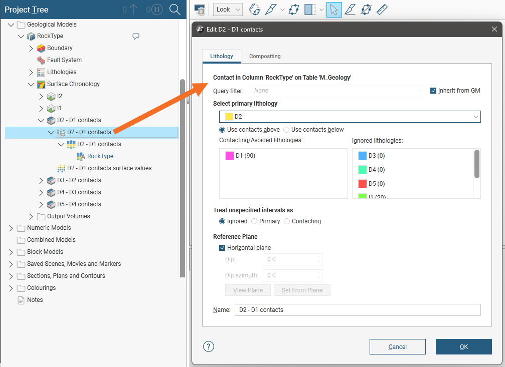 To edit the surface’s settings, double-click on it in the project tree. In the Lithologies tab, change the lithologies assigned to each side of the surface, if required.