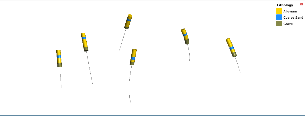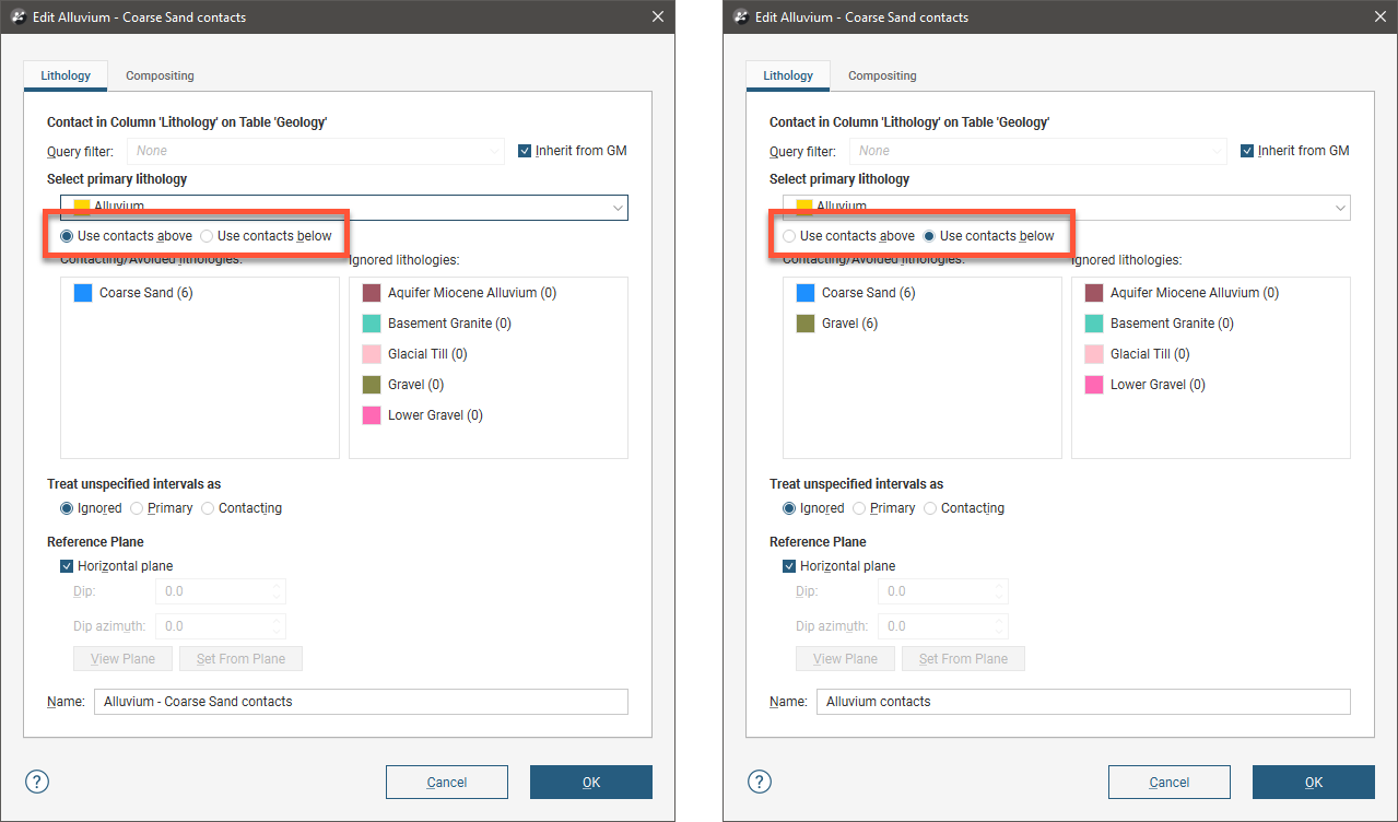 By default, Leapfrog Geo will show the contacts above the primary lithology, but you can use the Use contacts below option when, for example, one lithology is interbedded with another. Here we can see that the coarse sand is interbedded with alluvium:
