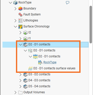 The new contact surface will appear in the project tree under the Surface Chronology. Add the contact surface to the scene to view it and check that it is oriented correctly.