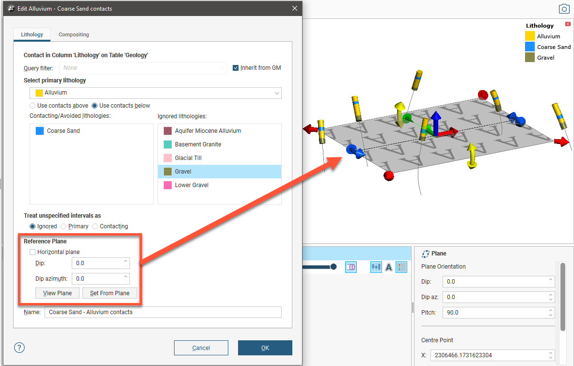 - Set the Dip and Dip Azimuth values in the New Contact Points window. The reference plane will be updated in the scene.