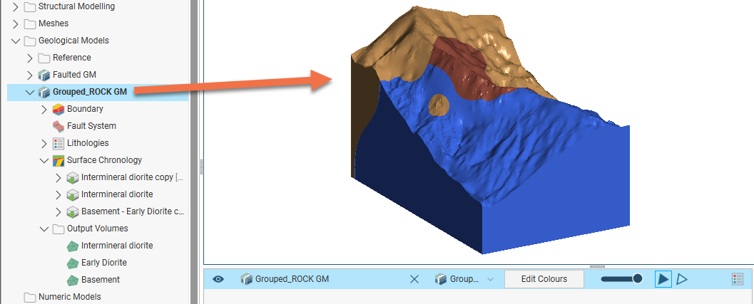 The View Object option adds the geological model to the shape list as a single object. You can also display the geological model in this way by dragging it from the project tree into the scene.