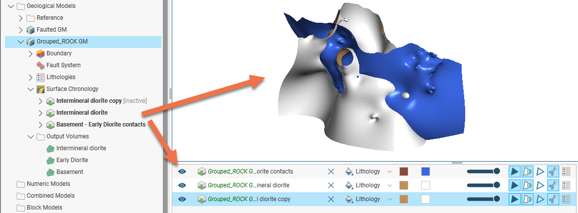 ) describes the contact surfaces in the model, organised in chronological order, from youngest to oldest. These surfaces and their chronology determine how the volume inside the model extents is divided into lithological units. When the model is first created, the Surface Chronology is empty, but it will eventually hold all contact surfaces and inputs to them. - The Output Volumes folder contains all the volumes (