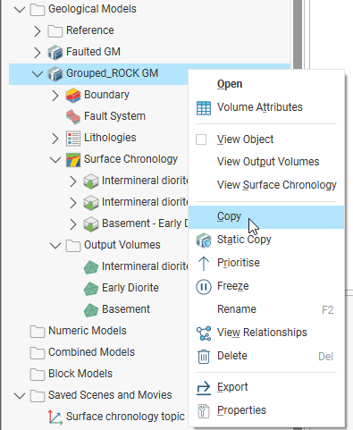To copy a geological model, right-click on it in the project tree and select Copy: