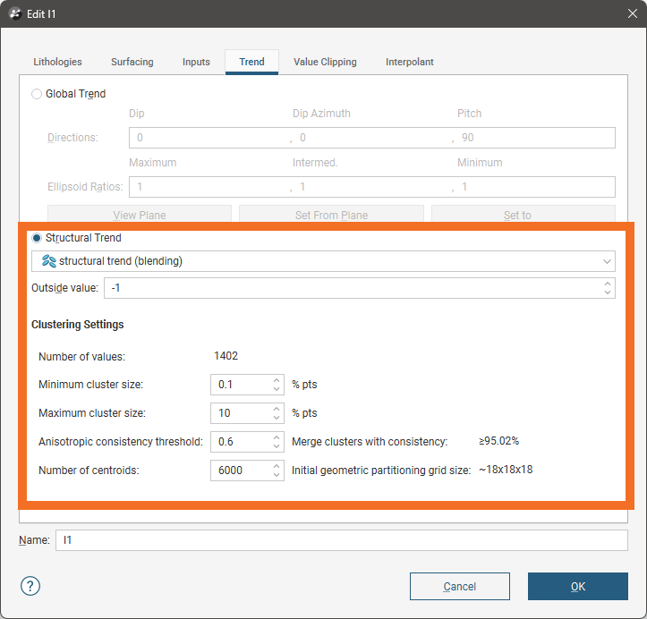 - When a structural trend is applied, Leapfrog Geo automatically does not clip the values. To clip values, untick Automatic clipping, then tick Do clipping. Again, Leapfrog Geo sets the Lower bound and Upper bound values from the data and you can change them, if required.
