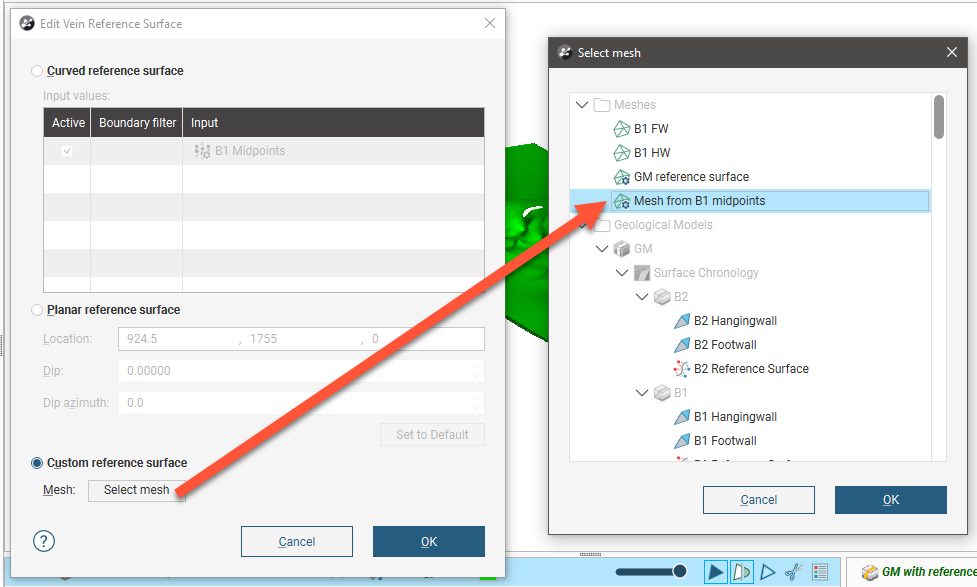 If you wish to use another surface in the project as a reference surface, double-click on the reference surface to open the Edit Vein Reference Surface window. Enable the Custom reference surface option, then select the mesh from those available in the project: