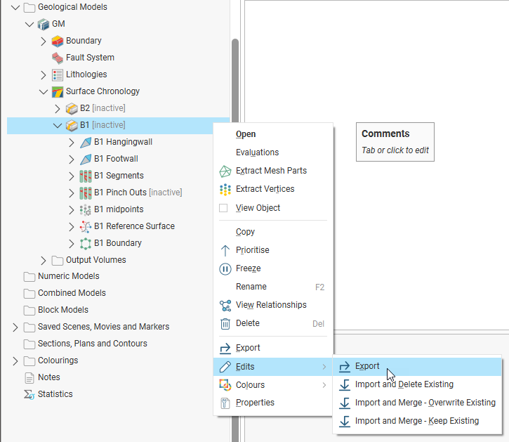 To export a list of vein edits, right-click on the vein in the project tree and select Edits > Export: