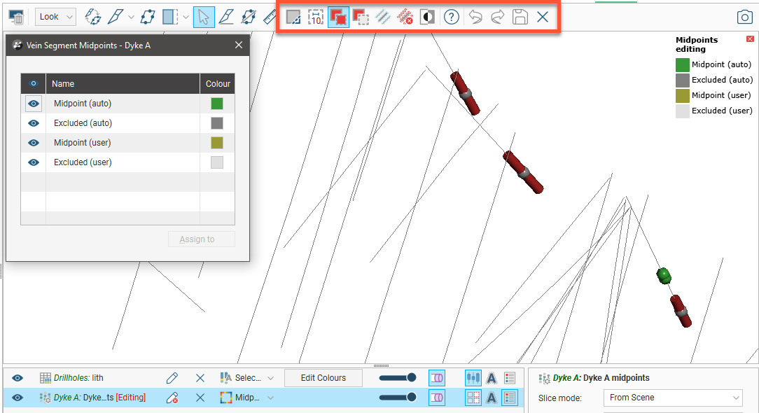 - Midpoint (auto) and Excluded (auto). These are the categories Leapfrog Geo assigned midpoints to when the vein was created. If Include mid points at the ends of holes is disabled, some midpoints may be automatically categorised as Excluded (auto), which is the case for three of the midpoints shown above.