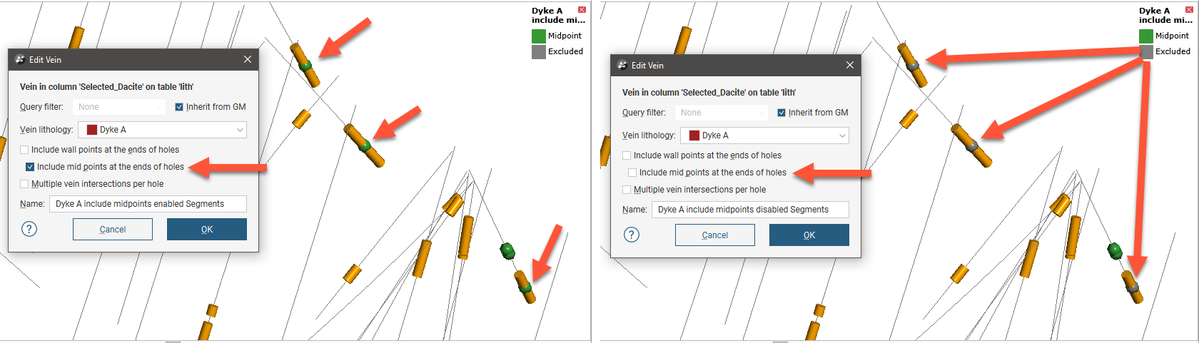 The Include mid points at the ends of holes affects how the midpoints are generated when vein lithology segments occur at the start or end of drillholes. When Include mid points at the ends of holes is disabled, the midpoints are still generated but are automatically excluded. In these examples, there are three segments where drillholes end with the vein lithology. On the left, Include mid points at the ends of holes is enabled and there are no excluded midpoints; all the midpoints are shown in green.