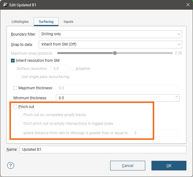 You can choose to use the query filtering already selected for the geological model by ticking the Inherit from GM box, or untick it and select from the available options in Query filter.