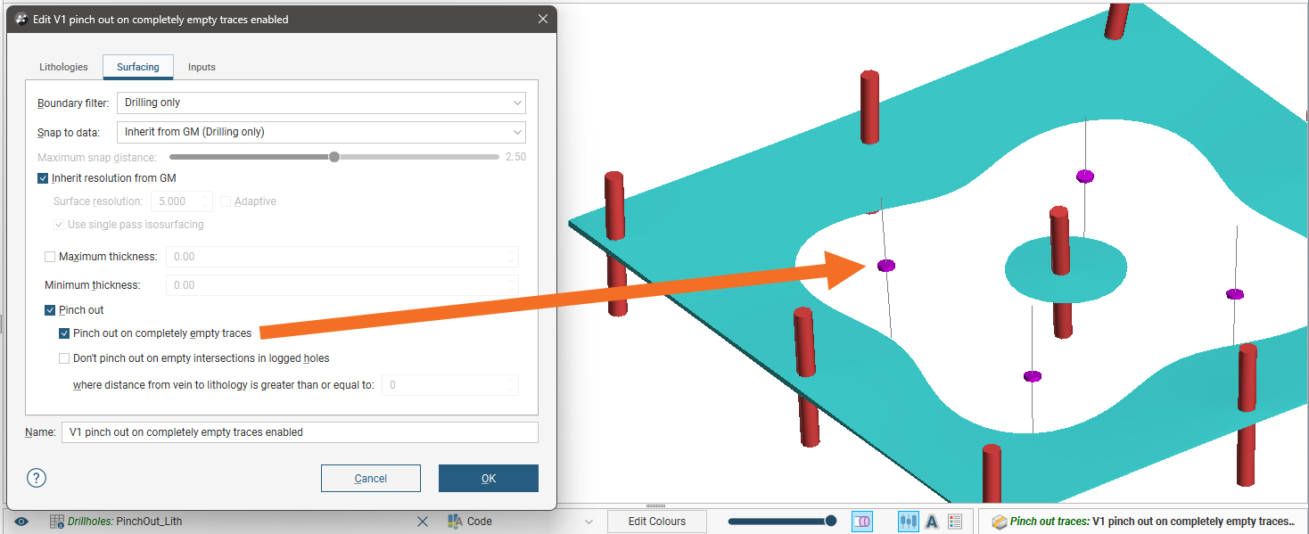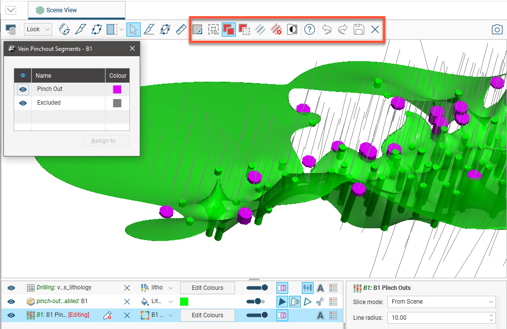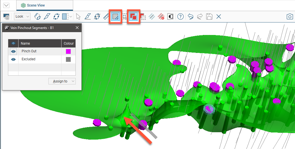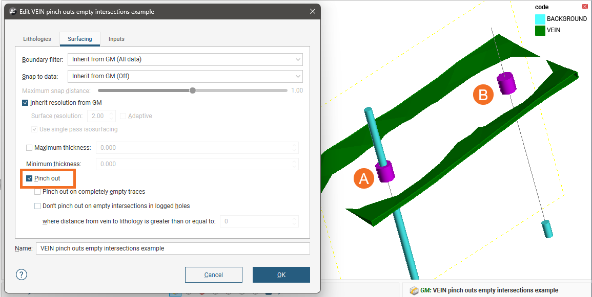 ) to view the effect of the excluded pinch out segments on the vein. In this example, excluding the two segments results in the vein terminating at the boundary of the geological model: