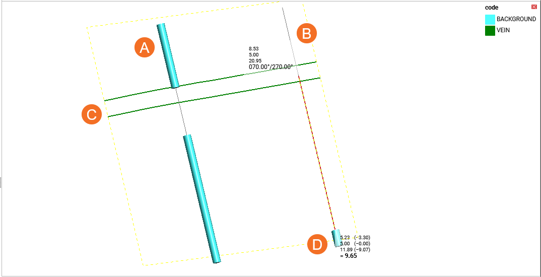 ) extracted from drilling data. Veins created from data other than drilling data will not have vein segments, pinch out segments or midpoints.- Vein segments are categorised into hangingwall segments, footwall segments or excluded segments. Excluded segments are those that are completely enclosed within the vein lithology and so do not have hangingwall or footwall contact points.