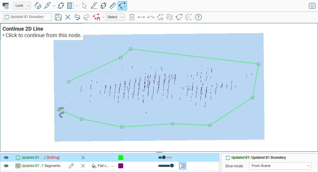 To edit the boundary using a polyline, right-click on it in the project tree and select Edit With Polyline. The current vein boundary will appear in the scene and the polyline editor will open. Begin drawing the new boundary, as described in Using the Polyline Editor, ensuring that the polyline drawn closes and does not intersect itself.