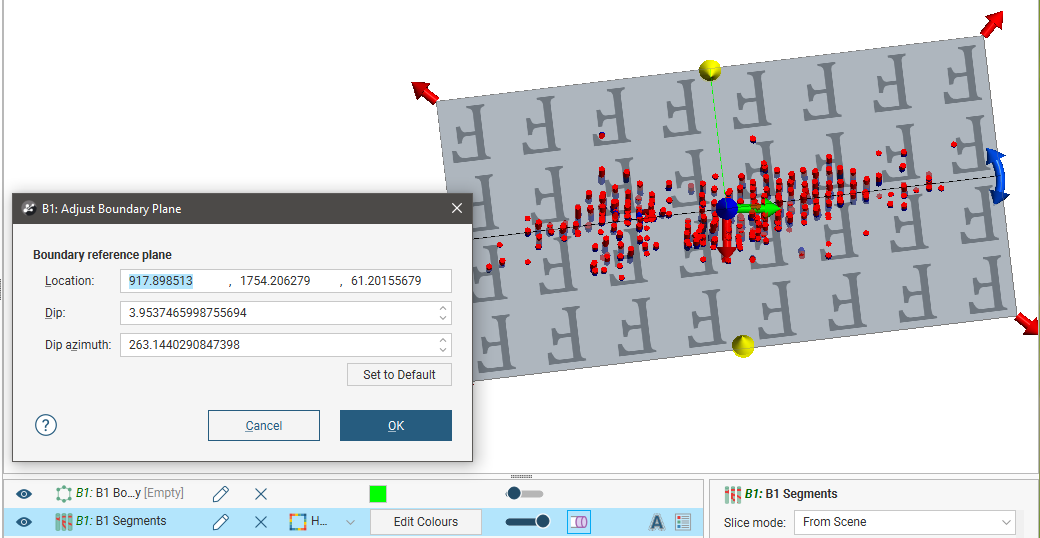 Another option for editing a vein boundary is to adjust the boundary plane. To do this, right-click on the boundary in the project tree and select Adjust Plane. The plane will be displayed in the scene, along with the Adjust Boundary Plane window. You can use the handles on the plane to adjust its position or you can enter the information in the Adjust Boundary Plane window.