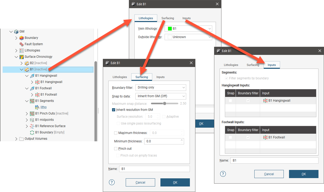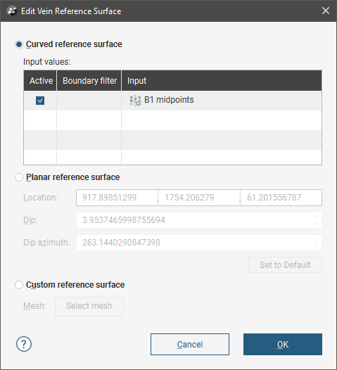 Double-click on the reference surface in the project tree; this opens the Edit Vein Reference Surface window and you can see what option is being used for the surface. In this example, the B1 vein has been created from lithology data and so it has a curved reference surface and the midpoints for the vein lithology are used as Input values: