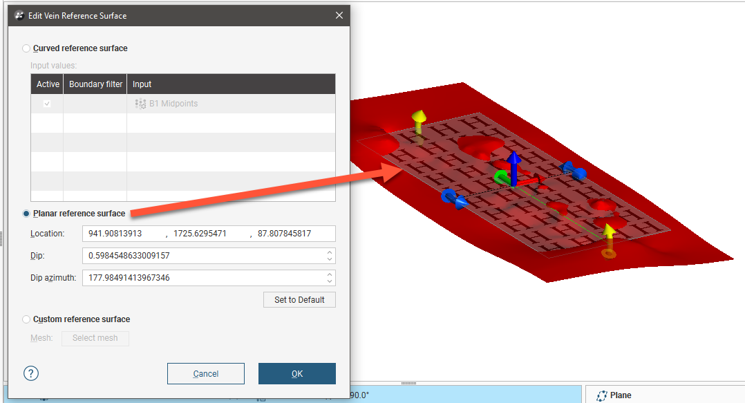 To use a planar reference surface for a vein created from lithology data, double-click on the reference surface to open the Edit Vein Reference Surface window, then select the Planar reference surface option. Adjust the plane in the scene, then click OK to reprocess the vein.