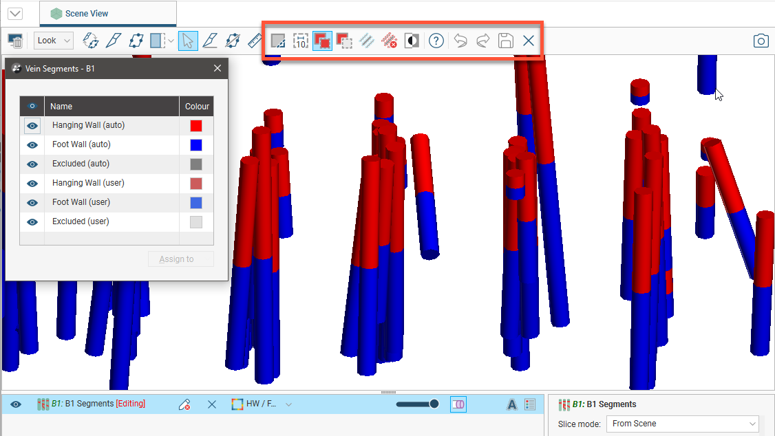 Displaying the different objects that make up the vein can help you in making decisions on how to edit the vein. There are some settings specific to veins, such as the option for displaying different vein components by their hangingwall/footwall assignments: