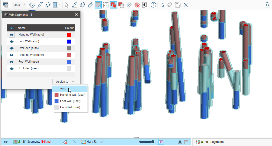 - Hanging Wall (auto), Foot Wall (auto) and Excluded (auto). These are the categories Leapfrog Geo assigned segments to when the vein was created.