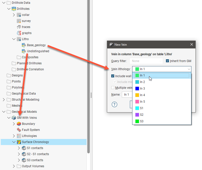 - Creating a vein system. This results in a single lithology that represents all the veins in a model. Veins and their interactions are defined within the vein system. See Vein Systems.