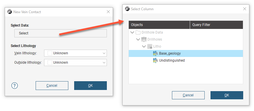In the New Vein Contact window under Select Data, click the Select button and choose the column containing the needed lithology information.