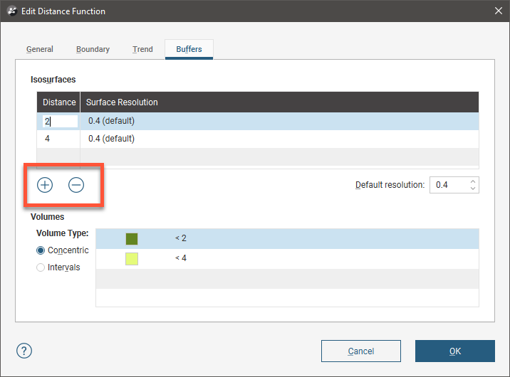 There are two options for Volume Type that affect how the buffers are calculated when more than one buffer is used. The Concentric option produces volumes that include any lower distance volumes. For example, here there are three volumes, <2, <4 and <6, and the colours used to display these volumes blend where the volumes overlap: