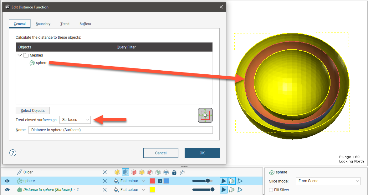 If you are unsure of some settings, most can be changed later. For a basic distance function click Select Objects to select from the suitable objects available in the project, then click on the Buffers tab to define at least one buffer so that the distance function can be visualised in the scene.