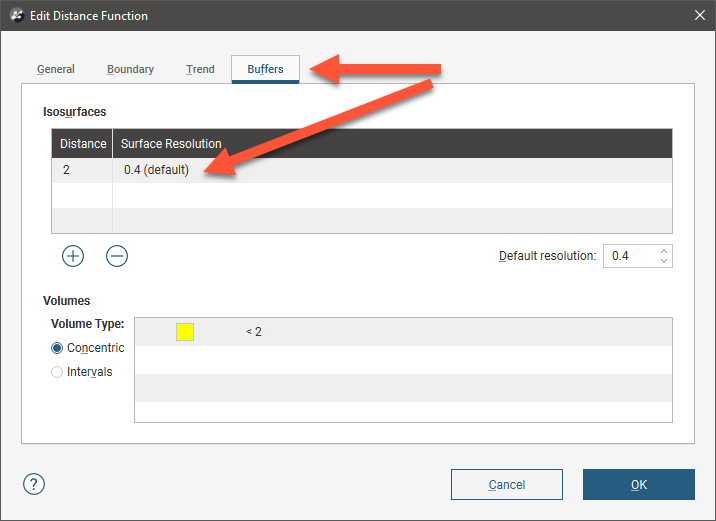 In the examples that follow, a distance function is created from a sphere and a single isosurface is defined in the Buffers tab, with its distance set to 2: