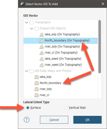 You can create the extent as a vertical wall or surface. If you create the lateral extent as a surface, you will be able to modify it using additional data, as described below. A lateral extent created as a vertical wall, however, cannot be modified.