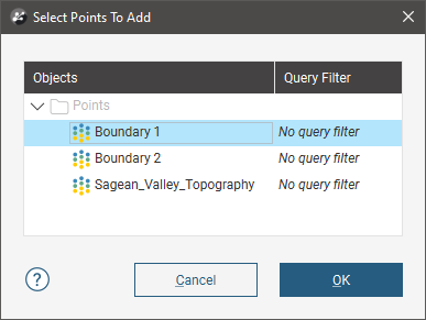 To create a new extent from points data, right-click on the interpolant’s Boundary object and select New Lateral Extent > From Points. The Select Points To Add window will be displayed, showing points data available in the project: