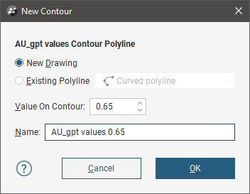 Adding a contour polyline is a useful tool for manually adjusting a surface to make it more geologically reasonable. To start adding a contour polyline, draw a slice where you wish to adjust the surface and decide what value you will assign to the contour line. Next, right-click on the values object and select New Contour Polyline. The next step is to choose whether you will draw a new polyline or use one already in the project: