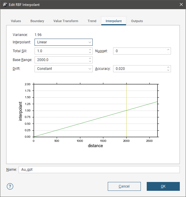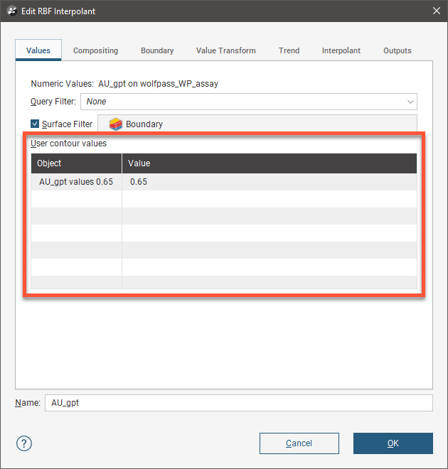 In older versions of Leapfrog Geo, the values used for an RBF interpolant could not be changed once it had been created. In Leapfrog Geo 2024.1, you can now changes the values used.