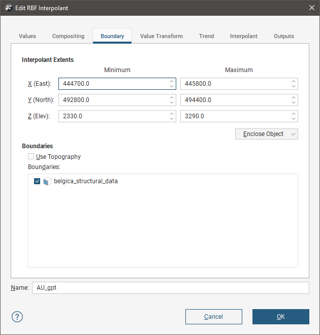 - Select another object in the project from the Enclose Object list, which could be the numeric values object being interpolated. The extents for that object will be used as the basis for the Custom boundary dimensions.