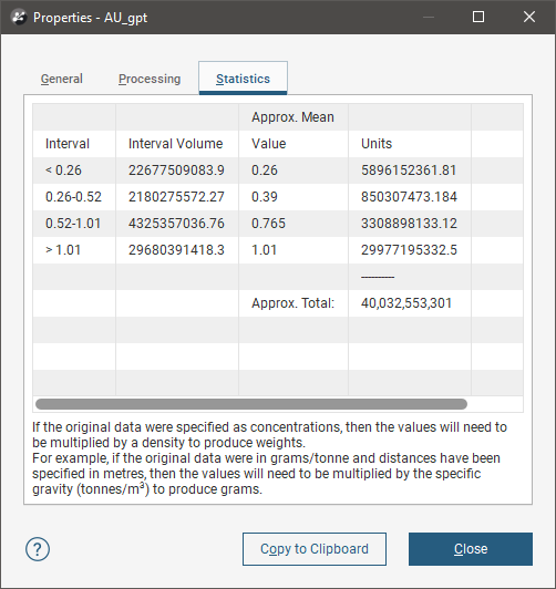 You can view the approximated mean for each output volume by right-clicking on the interpolant and selecting Properties. Click on the Statistics tab: