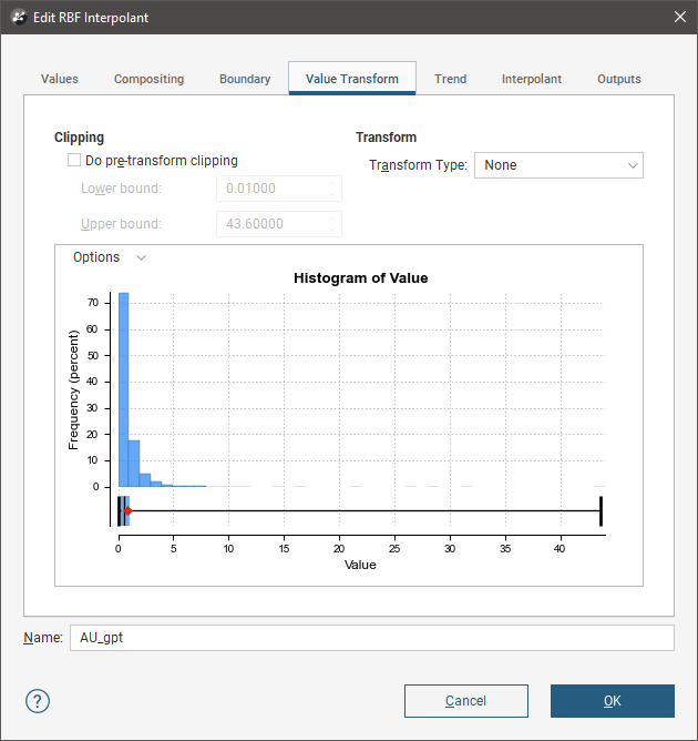 If you tick the Do pre-transform clipping option, you can set the Lower bound and the Upper bound to cap values that are too low or too high. For example, if you set the Upper bound from 14.00 to 10.00, grade values above 10.00 will be regarded as 10.00.