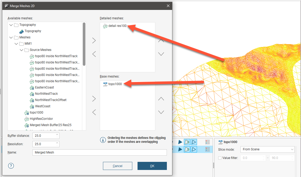 This option creates a new mesh from two or more open meshes and specifies the priority in which input meshes will be used to create the final mesh. This is useful when, for example, a single mesh is required that represents the topography (with less detail) and the area around a site (with more detail). To merge 2D meshes, right-click on the Meshes folder and select Mesh Operations > Merge Meshes 2D. In the window that appears, select the meshes you wish to use.
