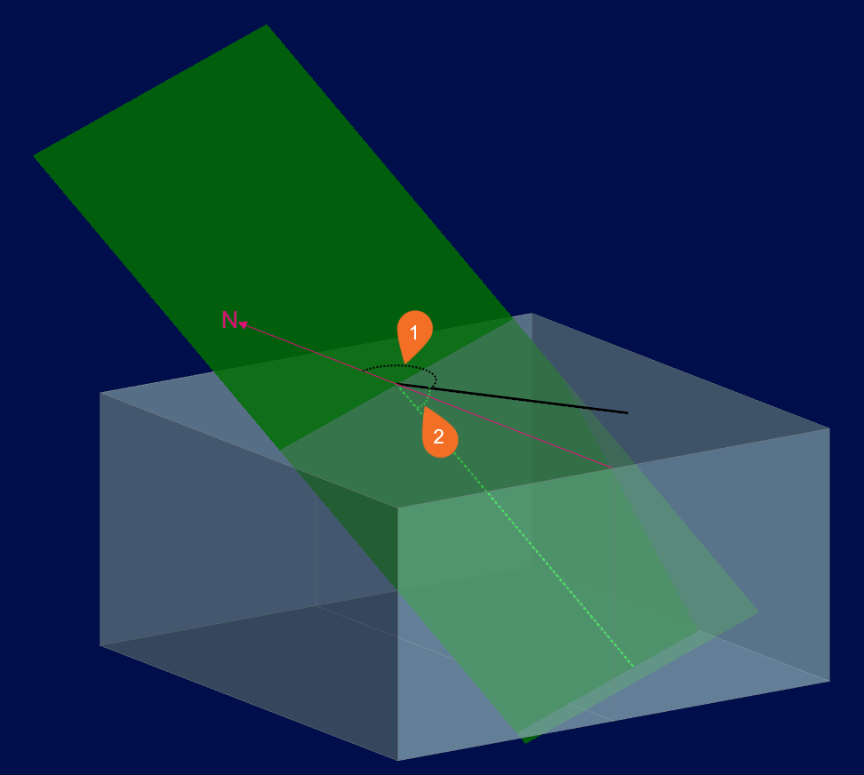 Dip azimuth is the angle between North and a line perpendicular to the strike, measured clockwise. In the following diagram, the dip azimuth is the angle marked (1), and the dip angle is marked (2).