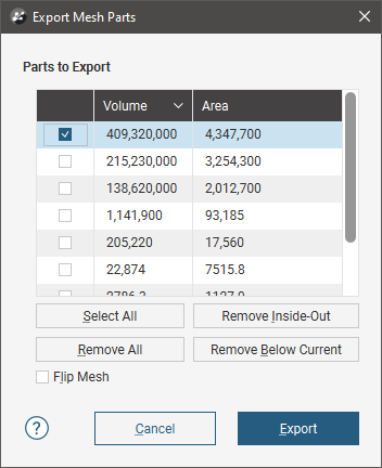 To export a mesh, right-click on the mesh and select Export. The Export Mesh Parts window will appear: