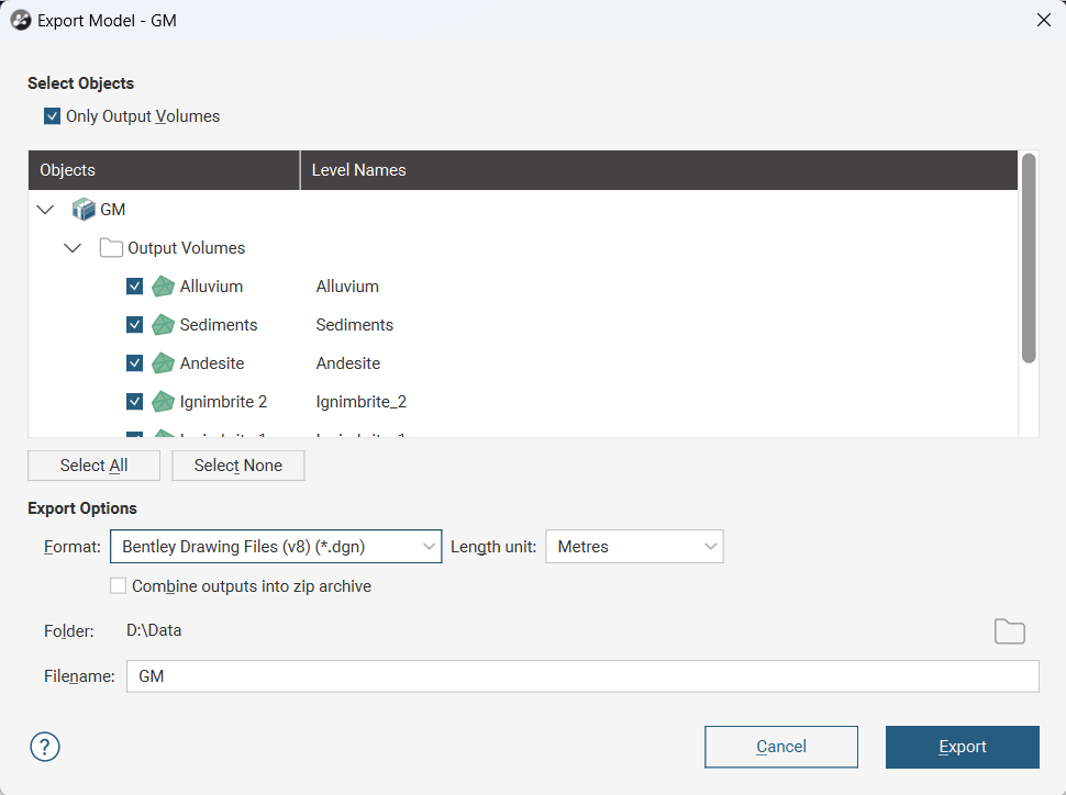 For geological models, if you wish to export surfaces other than the output volumes, untick the Only Output Volumes option.