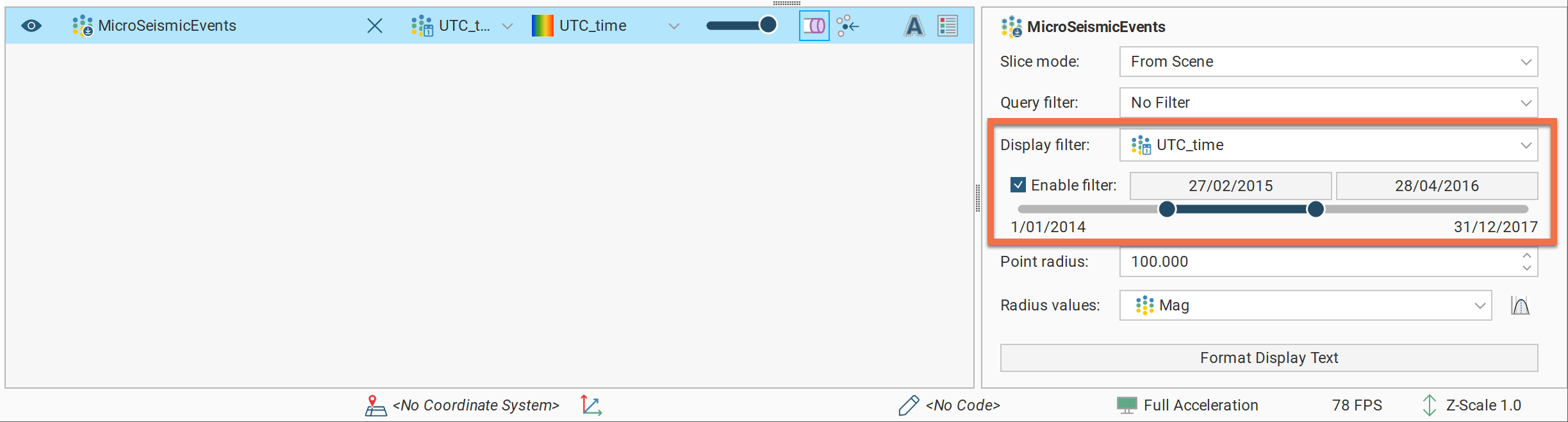 Time-dependent points can be filtered in the scene by another numeric column, e.g. a time or date column. This enables, for example, micro-seismic data to be visualised over time using a range slider. To view data in this way, click on the points table in the shape list, then select a time or date column as the Display filter in the properties panel: