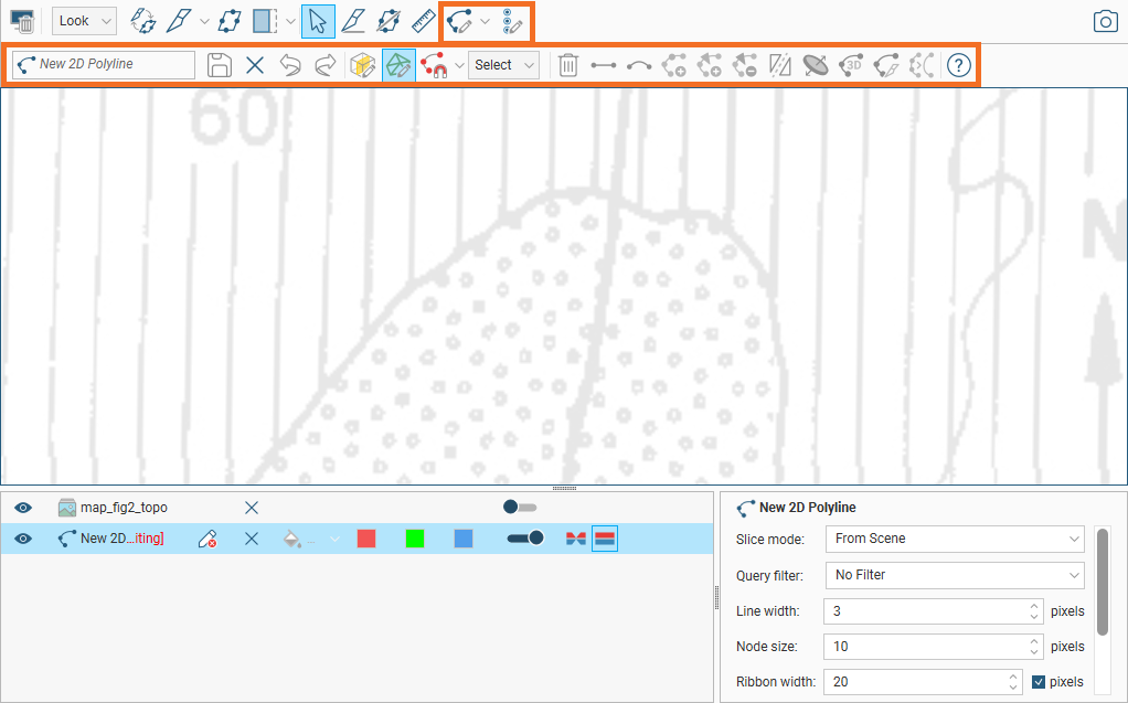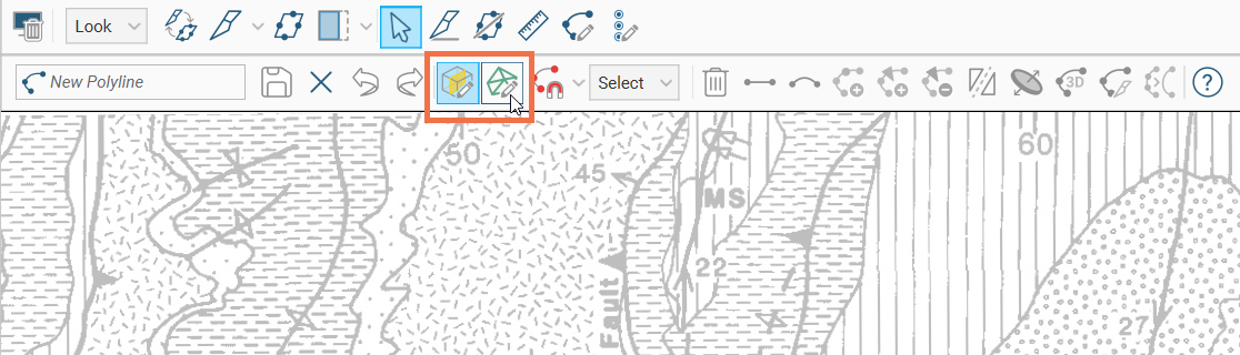 When you start drawing a polyline, the polyline editor will appear above the 3D scene. If you are drawing a GIS line or if the slicer was already in the scene, the drawing mode will be set to be on the slicer. Toggle between the two options using the toolbar buttons: