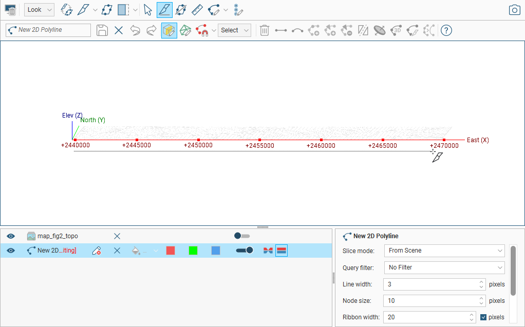 To begin, add an object to the scene. Here, a topography map is added. Next right-click on the Polylines folder and select New Polyline. The polyline editor will open: