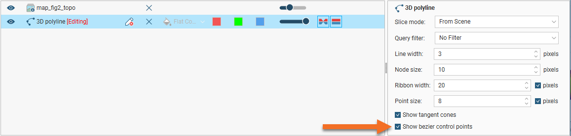) options help you to determine the orientation of the polyline in the scene. The surface ribbon reflects the orientation of the polyline and the normal ribbon is perpendicular to the surface ribbon.