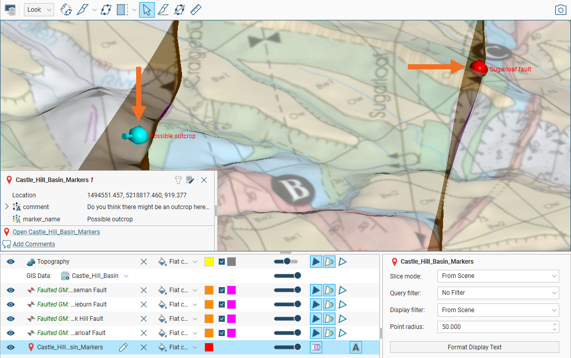 Here two markers are displayed in the scene. Clicking on a marker in the scene displays more information about the marker, including comments entered.